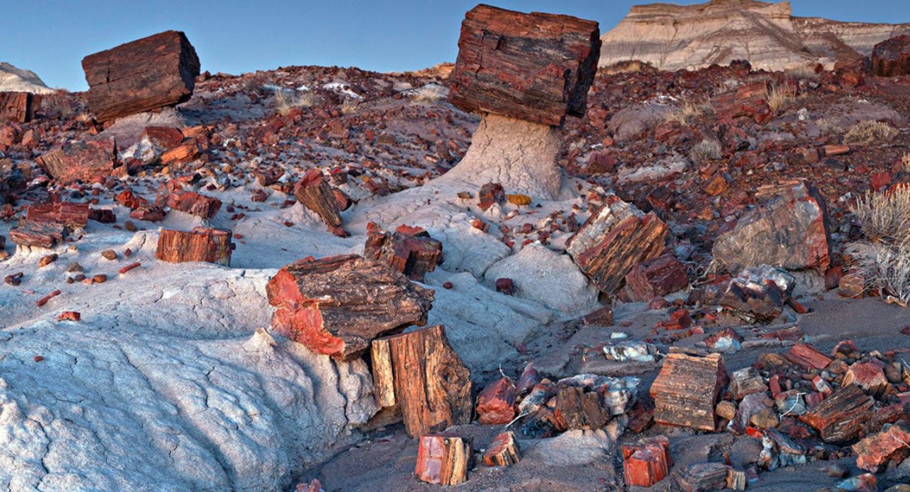 Petrified Forest National Park in northeastern Arizona spans approximately 346 square miles within the Painted Desert and is best known for its extensive and colorful deposits of petrified wood dating back around 225 million years to the Late Triassic Epoch.