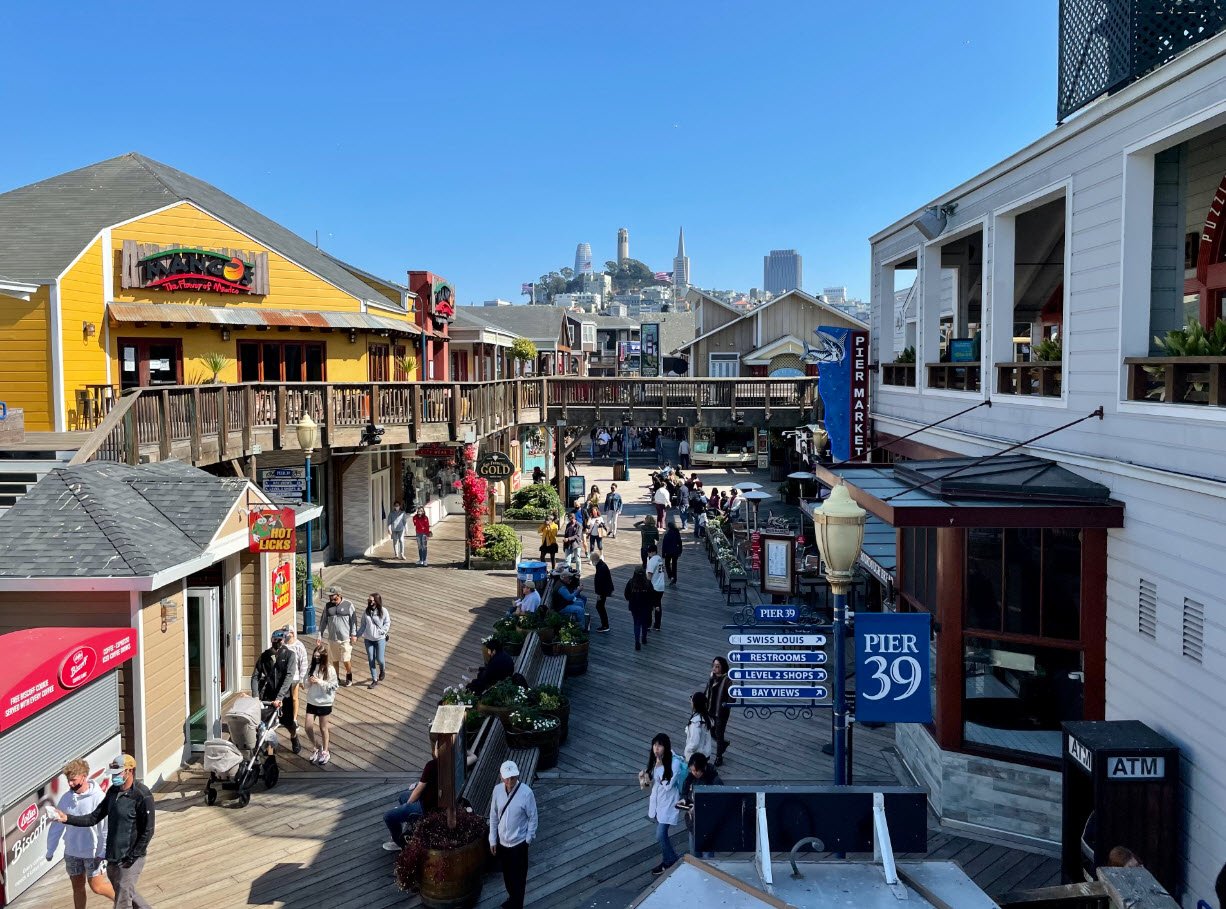 The pier offers spectacular views of the Golden Gate Bridge, Bay Bridge, Alcatraz, and Angel Island. It features two levels filled with shops, restaurants, street performers, a video arcade, and family-friendly attractions like the Aquarium of the Bay and a Venetian-style carousel.