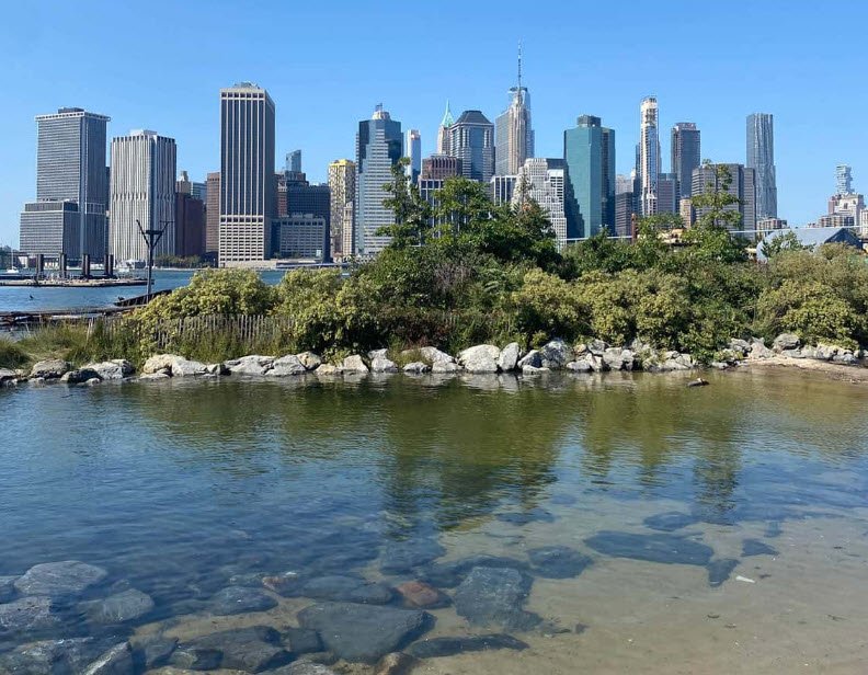 Remnants of a historic railroad float transfer bridge form the offshore island, while the beach offers stunning Manhattan skyline views, walking paths, and educational spots for observing diverse habitats, though swimming and wading are prohibited. Free and open to the public daily, it's accessible near Pierrepont Street with parking available, popular for relaxing strolls, picnics, birdwatching, and family outings amid the park's playgrounds and sports areas.