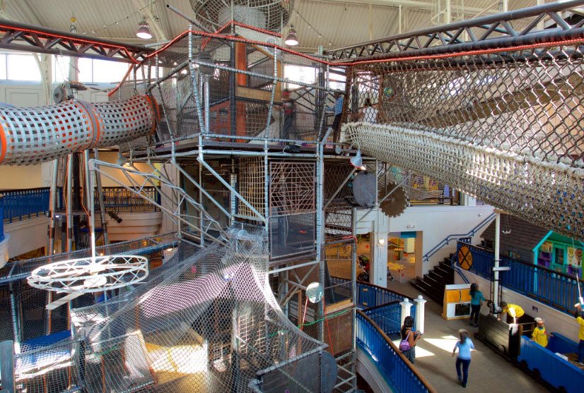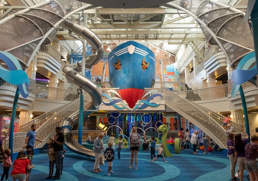 Visitors enjoy attractions such as the famous four-story SkyClimber, an indoor sports court, water activity areas, role-playing exhibits including a giant pretend cargo ship, and theater performances. The museum welcomes more than 265,000 visitors annually and is recognized as a top children's museum in the U.S., providing a safe, inclusive, and sensory-friendly environment for families.