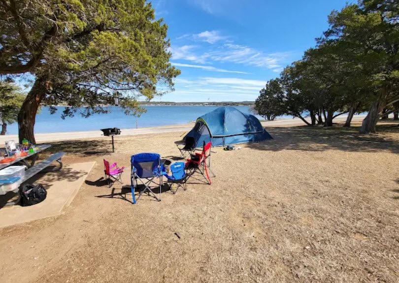 Acquired from the Brazos River Authority in 1940 and opened to the public in 1950, it features Civilian Conservation Corps-built rock structures from the early 1940s like culverts, a caretaker's cabin, and concession stand amid gently sloping beaches, steep cliffs, and white-tailed deer habitats.
