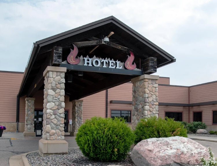 The 98-room hotel features an indoor pool, whirlpool, sauna, fitness center, conference space, RV parking, and dining at The Flames Sports Bar & Grill plus The Springs Restaurant & Lounge for steak and seafood, providing a full escape with 24/7 slots.