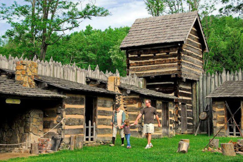 Pricketts Fort State Park in West Virginia features a reconstructed 18th-century log fort built in 1774 by the Prickett family on a small rise overlooking the confluence of Prickett’s Creek and the Monongahela River.
