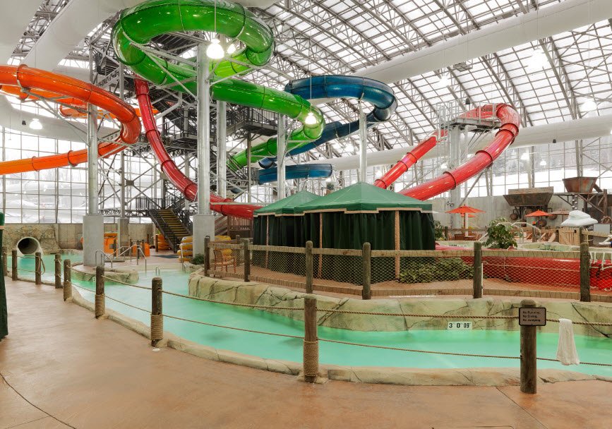 It includes numerous thrilling attractions such as an AquaTube water slide, an Open Flume slide, a Double Barrel FlowRider wave simulator, and La Chute, the first AquaLoop indoor water park slide in the U.S., which propels riders through a gravity-defying loop at speeds up to 40 mph.