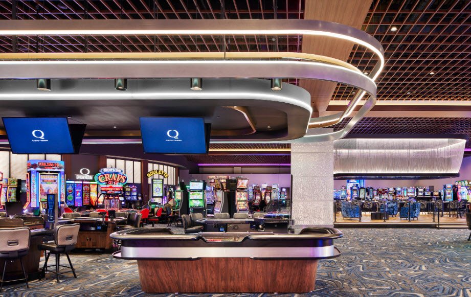 The facility offers over 500-1,000 slot machines, 17 table games like blackjack, craps, and poker variants, a Q Sportsbook, and operates daily (hours vary, e.g., 7am-midnight or later), for guests 21 and older, with amenities including a 116-room Hilton Garden Inn, Houlihan’s restaurant, Q Showroom and Back Waters Stage for concerts/comedy, Island Social family center and kitchen, casual dining, and event spaces.