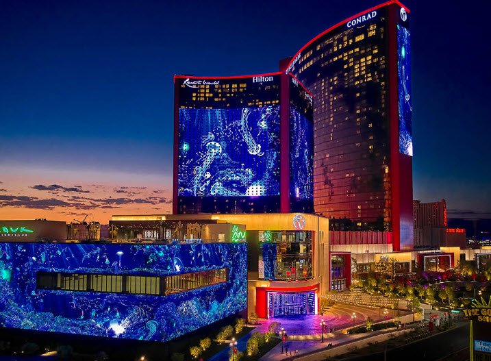 Resorts World Las Vegas is a massive, high-tech casino resort on the north end of the Las Vegas Strip in Nevada, USA, opened in 2021 with three Hilton-branded hotels: Las Vegas Hilton (1,678 rooms), Conrad Las Vegas (1,496 rooms), and ultra-luxury Crockfords (332 rooms), totaling 3,506 accommodations across a 59-story tower.