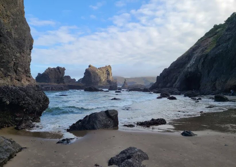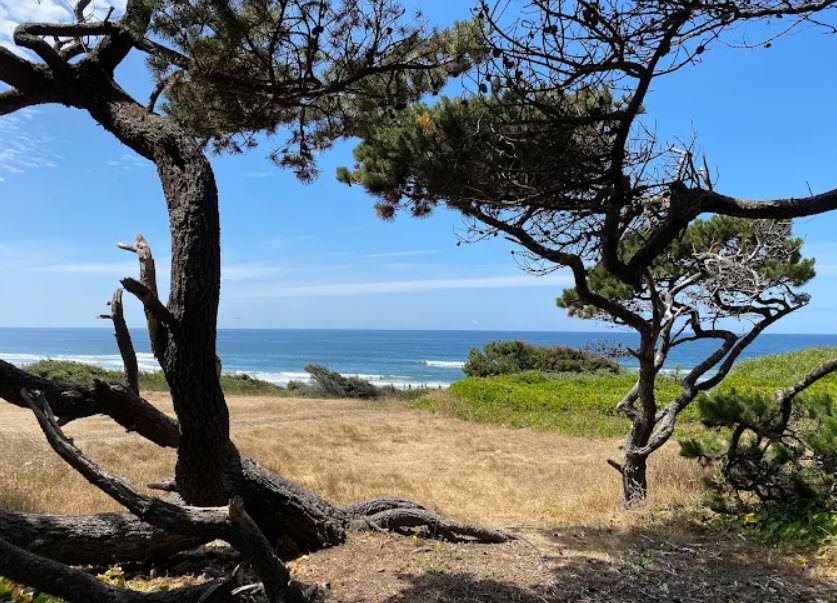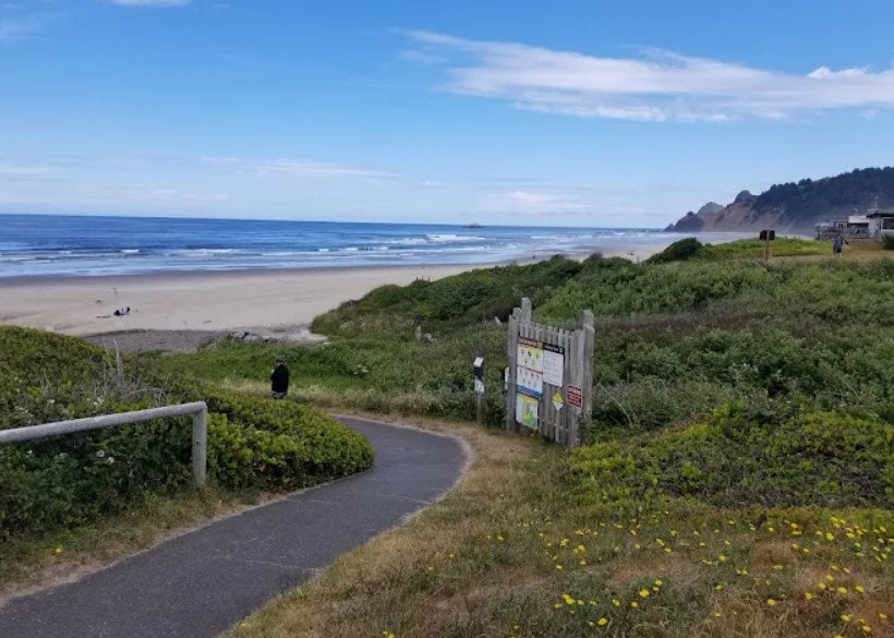 Nestled where the beach narrows toward Roads End Point amid quaint cottages, it offers ample parking, clean restrooms, picnic tables with ocean views, paved ADA-accessible paths and ramps leading to wide sandy beaches perfect for romantic strolls, long walks, beachcombing, and tidepool exploration around basalt islets and hidden coves passable only at low tide.