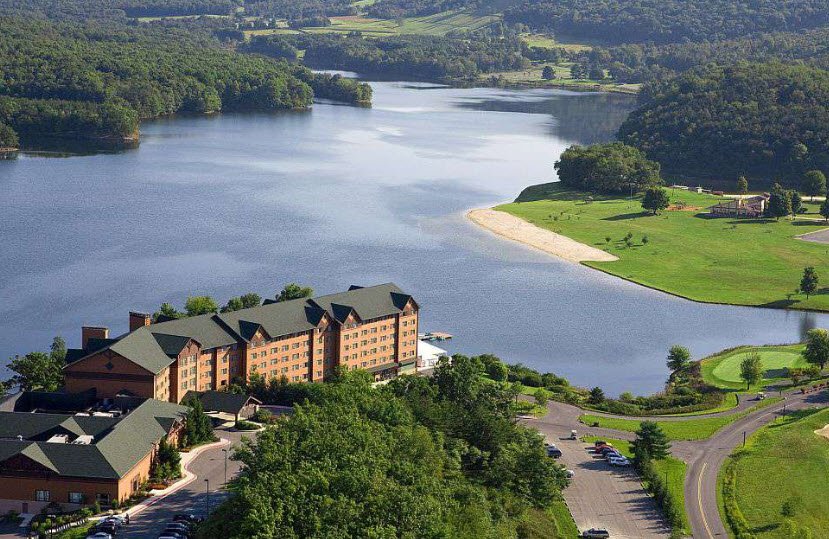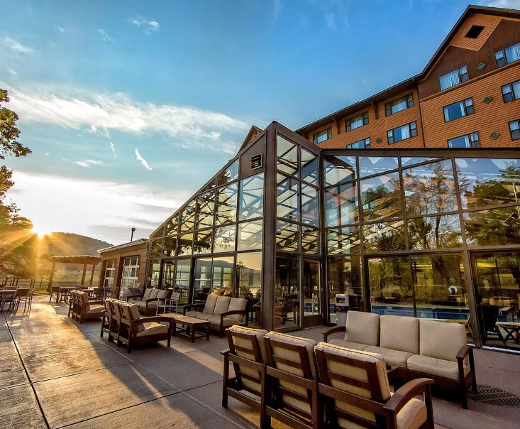 Guests enjoy additional perks like an outdoor pool, hot tub, conference spaces, and proximity to park activities including hiking and a private beach, making it a popular spot for relaxation and excitement accessible via I-68.
