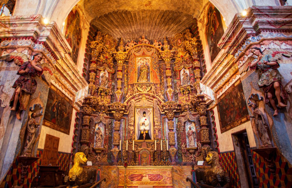 Located near Tucson on the Tohono O’odham Nation, the mission’s current church was built between 1783 and 1797, featuring thick adobe walls, vaulted masonry roofing, and intricate Baroque design elements on both the interior and exterior. Its detailed artistry includes vivid murals, statues, and decorative motifs combining Spanish, Moorish, and Aztec influences, many created by artisans brought from Mexico.