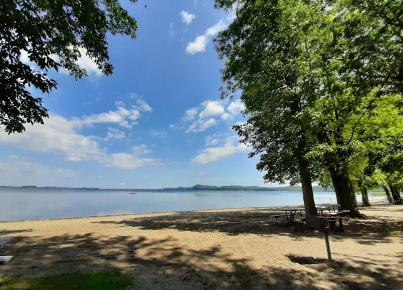 Established in 1933 with a historic Civilian Conservation Corps stone bathhouse, it boasts a 2,000-foot sandy beach with shallow, warm waters perfect for family swimming, plus canoe/kayak rentals, boating, fishing, picnicking with grills and shelters, volleyball, horseshoes, a playground, and wildlife viewing near the adjacent Sand Bar Wildlife Refuge. Open Memorial Day to Labor Day, it's a bustling summer spot just north of Burlington for relaxed lakeside fun amid scenic views.