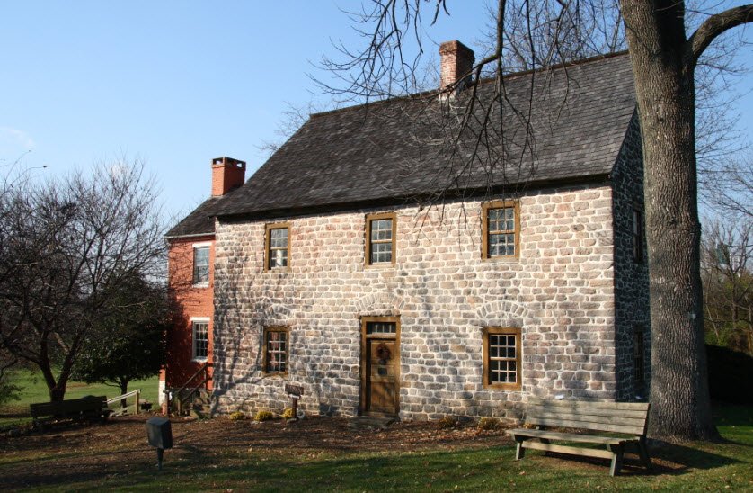 The stone house features thick sandstone walls, hand-hewn oak beams, and traditional German design elements including cross-and-bible doors and a unique wishbone chimney system, reflecting how German settlers adapted their cultural traditions to the American frontier. Originally part of a large family farm established in 1736, the house remained in the Brunner family until 1899 and later underwent restoration by the Frederick County Landmarks Foundation to preserve its historic and architectural significance.
