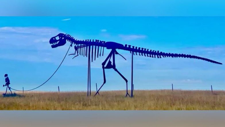 This unusual piece of art depicts a skeletal figure walking a skeletal T-Rex dinosaur on a leash, creating a quirky and memorable scene for travelers. The artwork was created by Clarence Hullinger with help from his sons and is linked to the nearby Original 1880 Town, a recreated historic village showcasing buildings and relics from the late 19th to early 20th centuries.