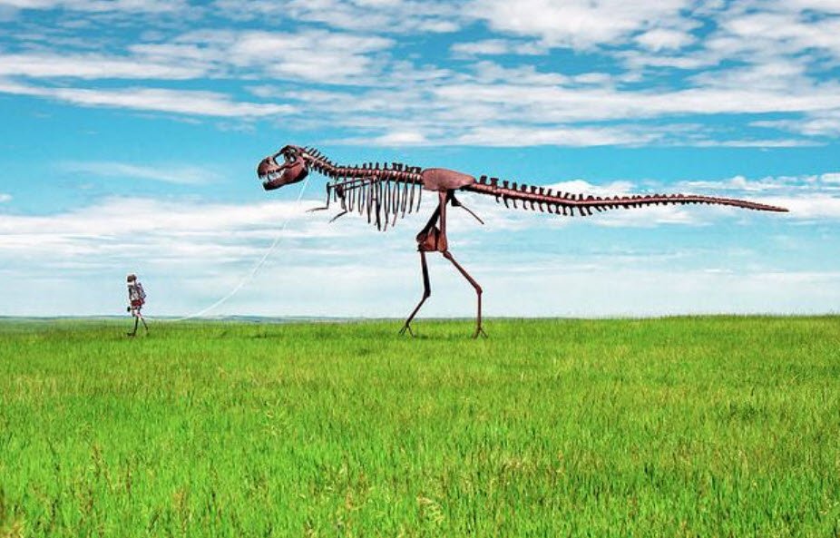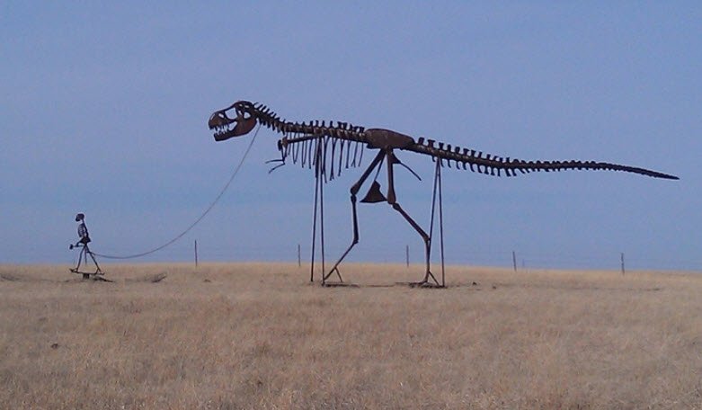 The Skeleton Man Walking Skeleton Dinosaur is a unique roadside sculpture near Midland, South Dakota, alongside Interstate 90.