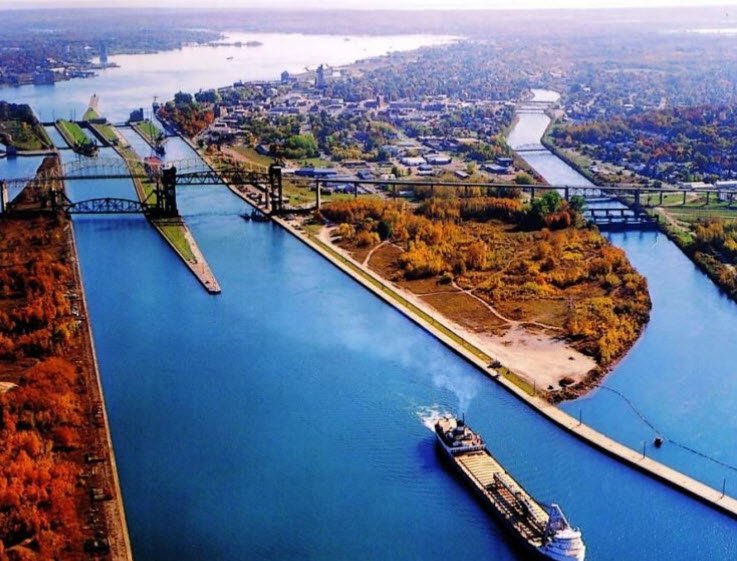 The Soo Locks in Michigan, located on the St. Marys River between Lake Superior and Lake Huron, are a critical engineering marvel that enable ships to bypass the 21-foot rapids of the river by raising and lowering vessels between different lake levels.