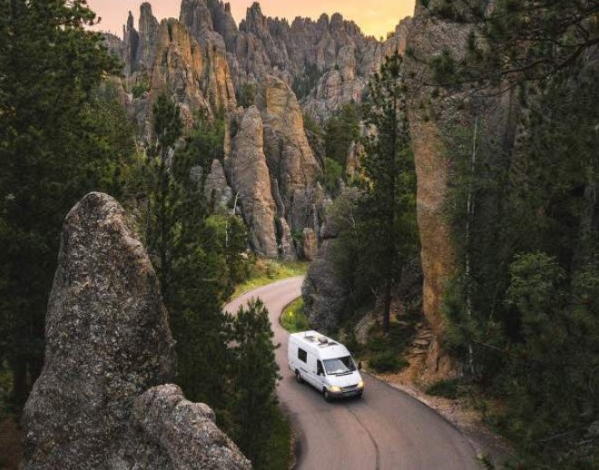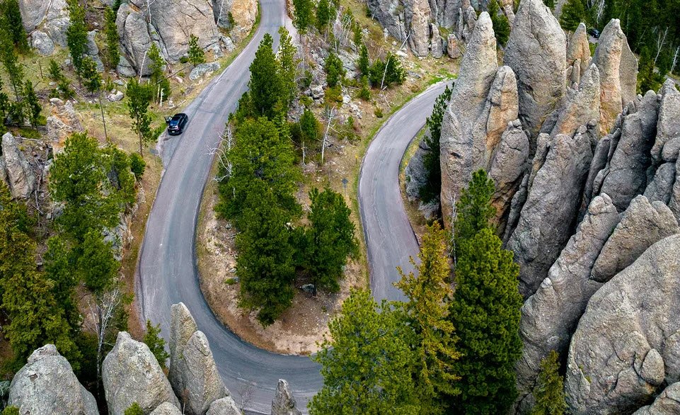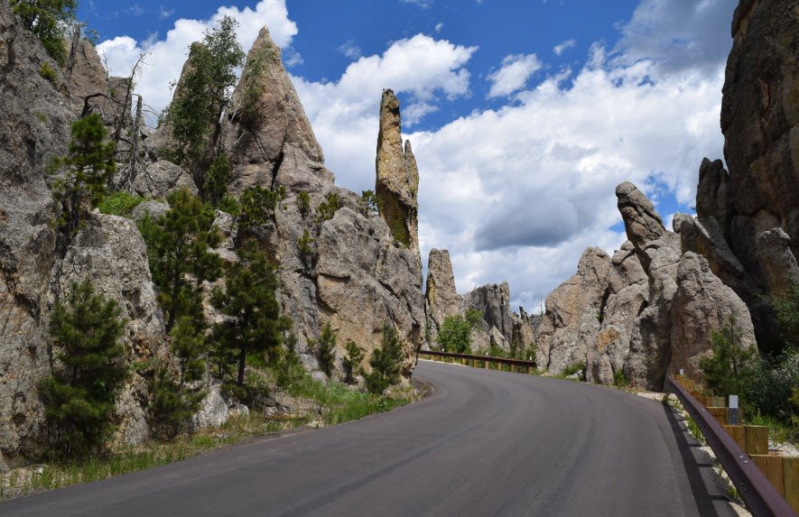 Starting near Wind Cave National Park, it travels north through Custer State Park and ends near Hill City. The road is famous for its winding curves, sharp turns, and narrow tunnels carved through granite rock formations, including the iconic Needles Eye Tunnel. Named for its towering granite spires called "needles," it offers spectacular views of pine and spruce forests, meadows, and rugged mountains.