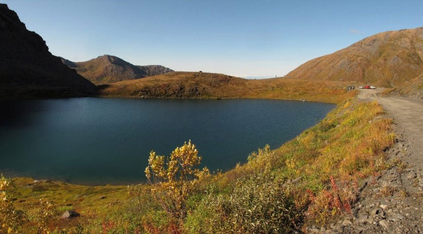 Summit Lake State Recreation Site is a high-alpine park at 3,886 feet elevation along Hatcher Pass Road (milepost 19.6) in the Talkeetna Mountains, about 60 miles north of Anchorage near Palmer in Alaska's Mat-Su Valley, offering stunning panoramic views of glacially carved peaks, tundra, and the lake itself amid wildflower meadows.
