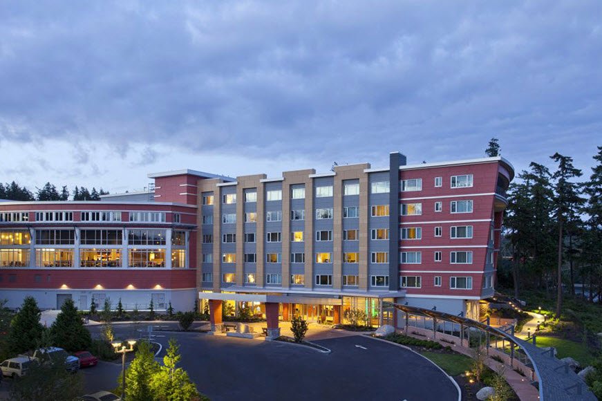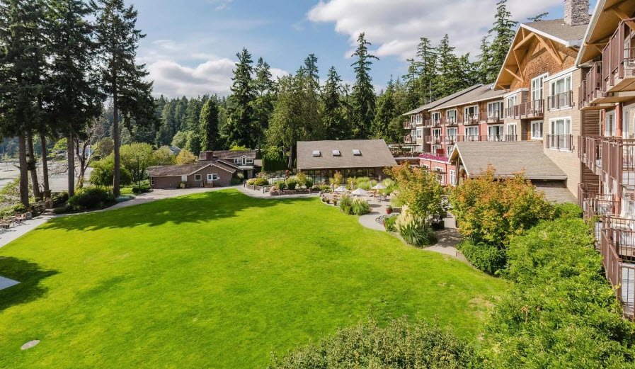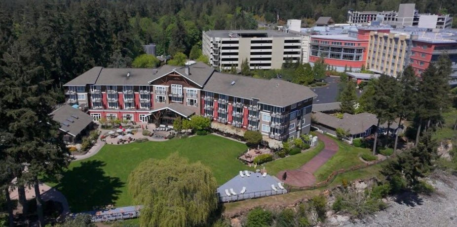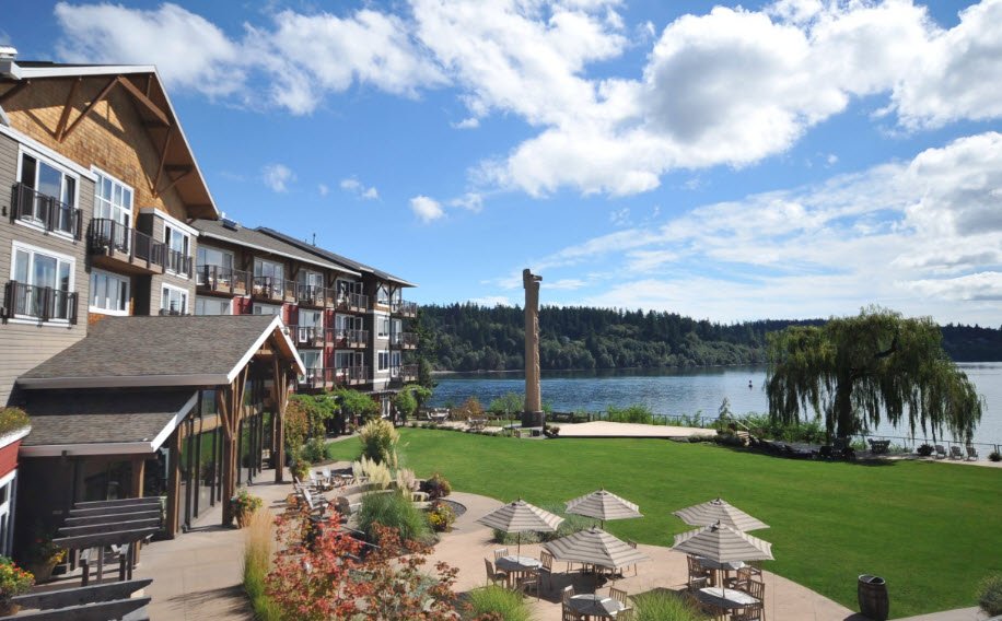 The property offers 183-184 recently renovated rooms and suites across a hotel tower and resort with Puget Sound views, an indoor zero-entry pool, seasonal outdoor hot tub, Angeline Spa, fitness center, beach access, six restaurants and cafes, four bars with live music, a Native American art gallery, 13,000 square feet of event space for up to 600 guests, and an 18-hole golf course nearby.