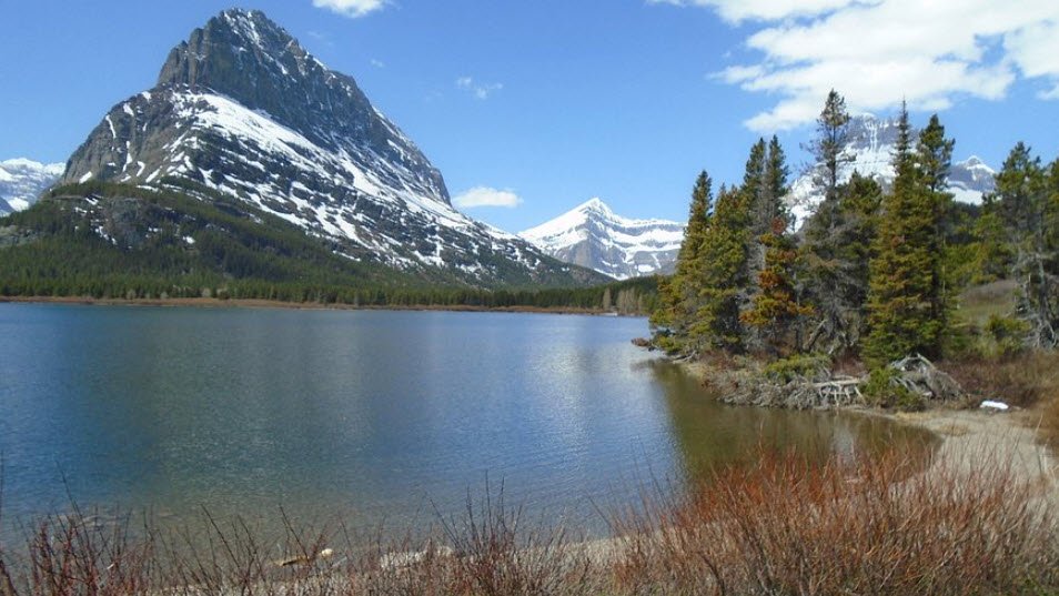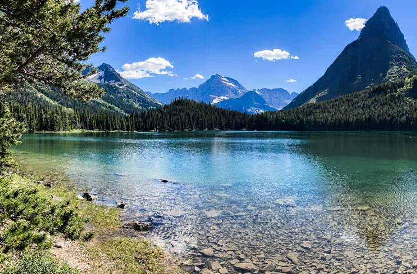 It is surrounded by towering snow-capped mountains, including Mount Gould and Grinnell Point, creating stunning scenic views. The lake features clear, cool waters and offers recreational activities such as boat tours, kayaking, and fishing.