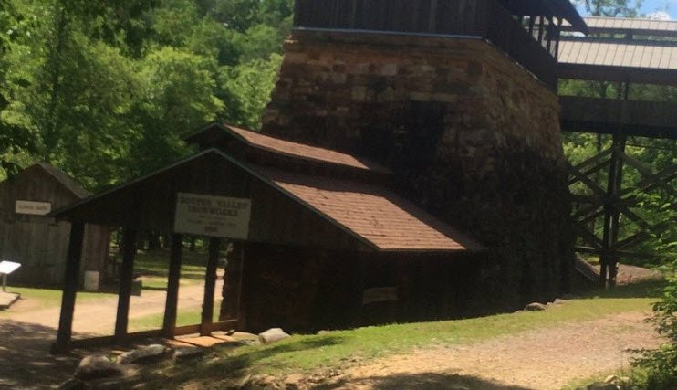 Established around 1830 with early bloomeries and expanded in the 1850s-1860s into three massive blast furnaces built largely by enslaved labor, it produced up to 22 tons of pig iron daily before Union forces destroyed most of it in a 1865 raid.