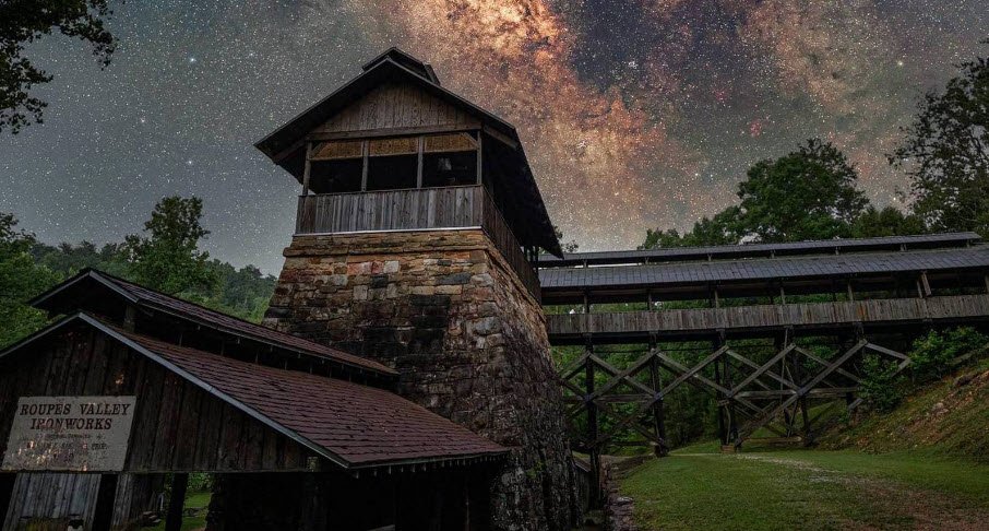 Today, visitors explore the well-preserved furnace stacks, a historical museum with artifacts like Civil War shells, over 40 restored pioneer log cabins, a working gristmill, plantation structures, and trails for hiking, biking, camping, and other outdoor activities amid wooded landscapes.