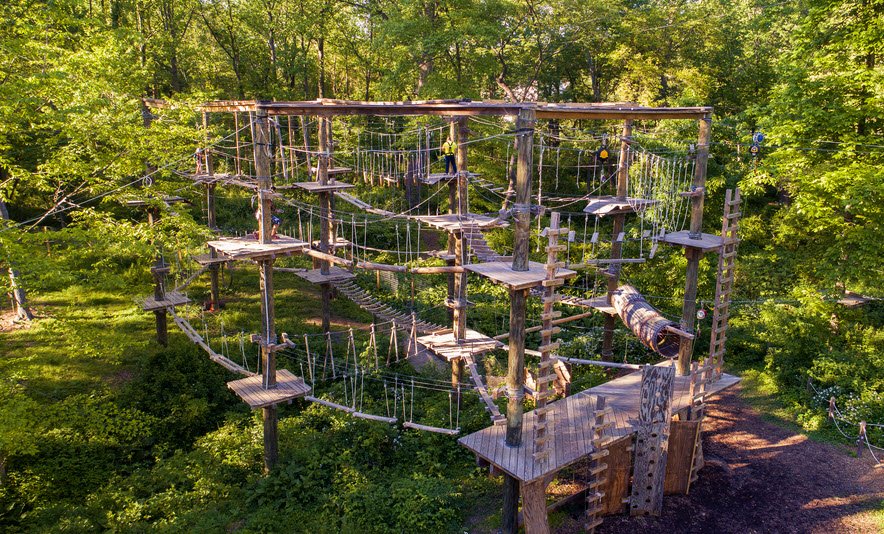 The Adventure Park at Sandy Spring in Maryland is the largest aerial forest adventure park in North America, offering an expansive outdoor climbing and ziplining experience set across about three and a half acres of forest.