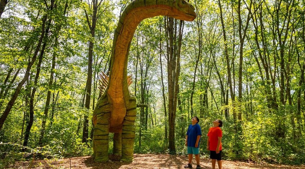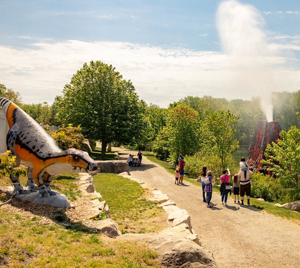 Special touches like a simulated erupting volcano, mini-golf, pedal go-karts, train rides, and multiple play areas create an immersive experience, while educational signs and events throughout the year help visitors of all ages learn about prehistoric life in a fun and interactive setting.