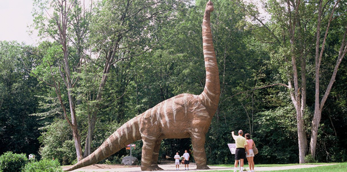 The Dinosaur Place in Connecticut is a 60-acre dinosaur-themed adventure park located in Montville and is known as the largest dinosaur park in New England, featuring more than 60 life-sized dinosaur models along 1.5 miles of scenic trails.