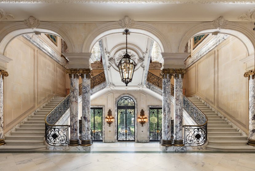 Designed by architect Horace Trumbauer, it is modeled after the 18th-century Château d'Asnières in France, exhibiting classical French elegance with American innovation. The house was constructed with fireproof materials and clad in Indiana limestone, featuring 50 rooms over three stories including grand formal spaces like a ballroom and an entrance hall with marble floors and a sweeping staircase. The estate includes meticulously designed gardens inspired by French landscaping and additional buildings such as a large garage built to accommodate automobiles.