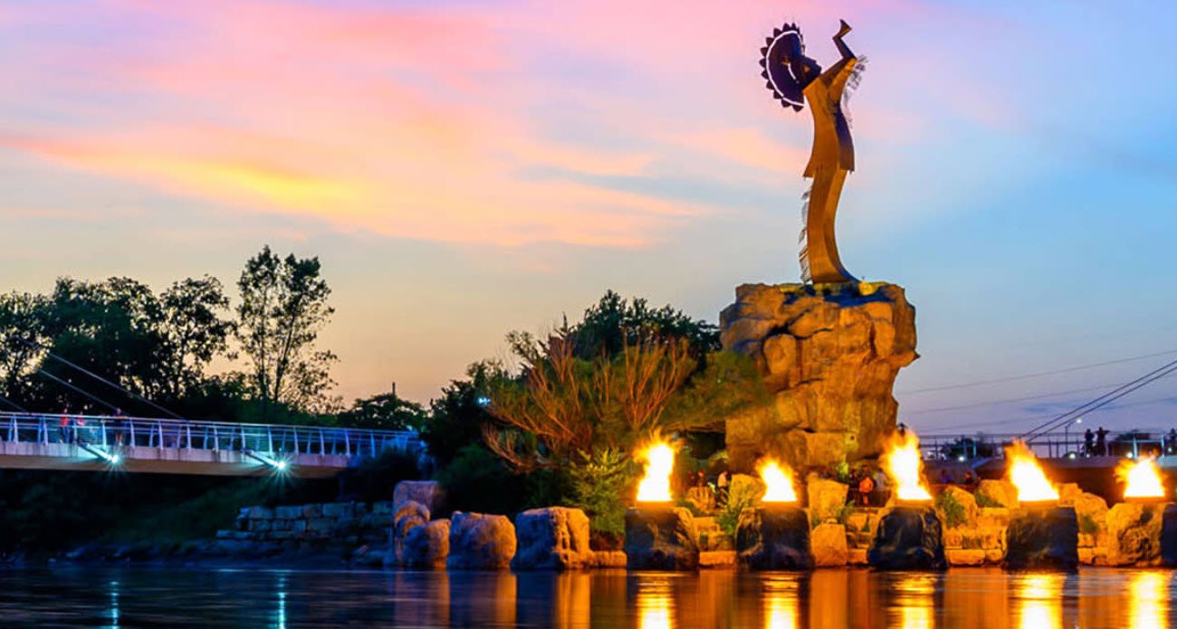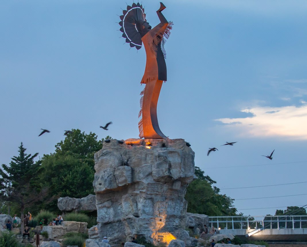 The statue stands elevated on a 30-foot rock promontory and depicts a Native American figure with hands raised in prayer to the Great Spirit, symbolizing unity and respect for the Indigenous tribes of the region. It serves as a powerful cultural icon for Wichita and a tribute to the Native American heritage that continues in the area. At night, fire drums at the base light the statue in a dramatic Ring of Fire ceremony, enhancing its spiritual atmosphere.
