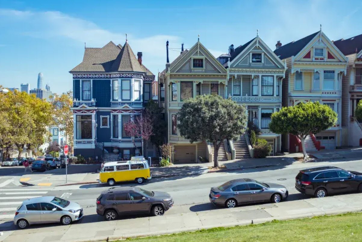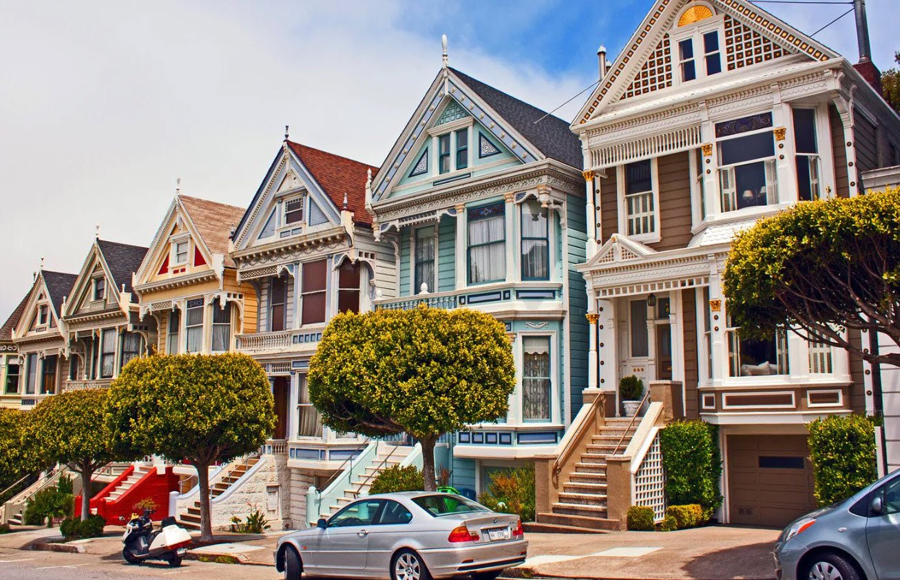 The Painted Ladies in San Francisco are a famous row of Victorian and Edwardian-style houses located along Steiner Street, near Alamo Square Park, also known as the "Seven Sisters" or "Postcard Row."
