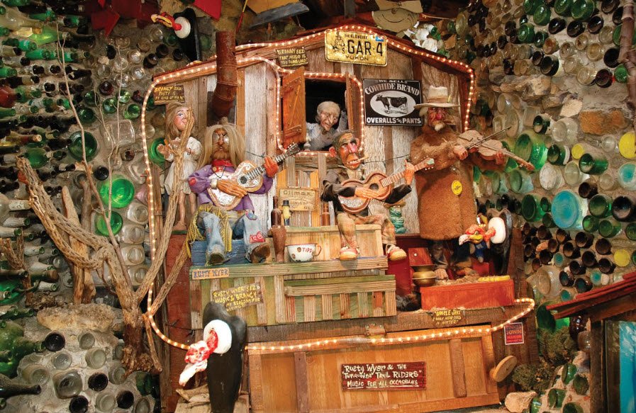 The 22-room museum is constructed from over 50,000 glass bottles cemented together, with walls adorned by wagon wheels, old store fronts, and western memorabilia, housing eccentric collections like 280 wedding cake toppers, antique tools, bullet pencils, and coin-operated machines such as Esmeralda the Fortune Teller and Otto the One-Man Band.