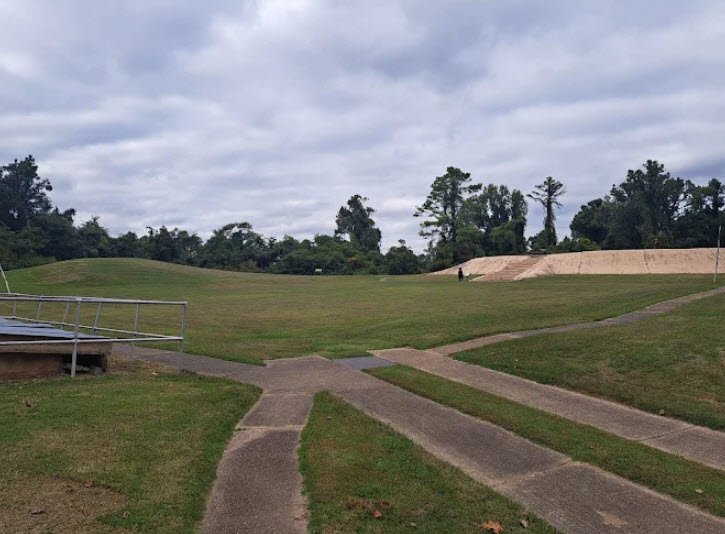 Amid wetlands, bluffs overlooking the Mississippi River floodplain, and the Mississippi Flyway bird migration route hosting over 140 species, the park features an Olympic-size seasonal swimming pool, 45 RV/tent campsites with hookups, six miles of hiking trails like the 4-mile Discovery Trail to Chucalissa Indian Village and museum, picnic shelters, tennis/basketball courts, softball fields, a nature center with exhibits, and an interpretive center opened in 2017.