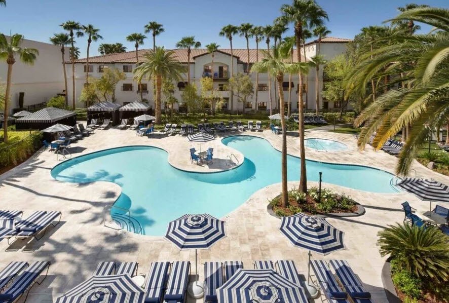 Guests enjoy two outdoor pools, hot tubs, a full-service spa with massages, fitness center, free parking, and over 40,000 square feet of meeting space, earning praise for value, quiet comfort, and proximity to conventions and the airport.