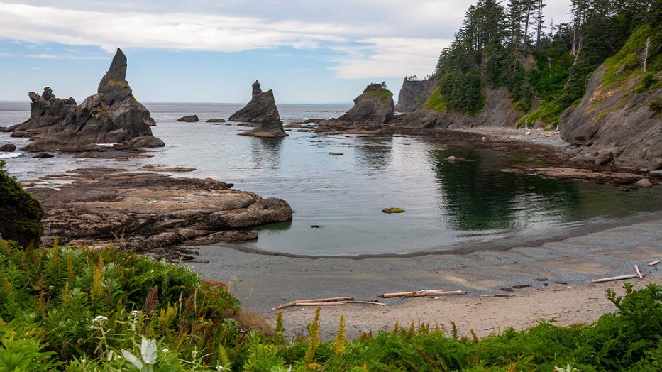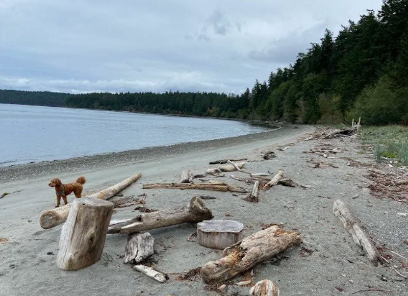 Reachable by car with limited parking or by boat, it features a short walking trail down to the tidelands, four picnic sites with fire pits, a grassy lawn, and a vault toilet, making it ideal for beachcombing, clamming, and relaxing amid lush greenery. Visitors enjoy exploring around Flat Point for additional beach access and serene coastal scenery without overnight camping options.