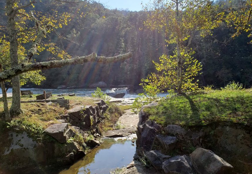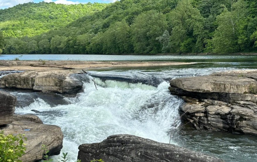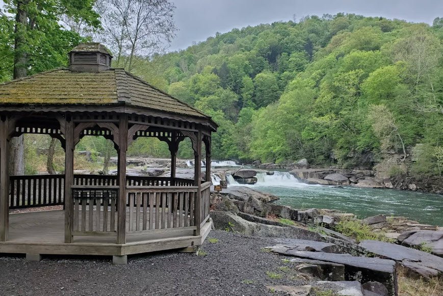 Valley Falls State Park in West Virginia, USA, covers 1,145 acres along both banks of the Tygart Valley River near Fairmont, featuring a dramatic half-mile series of four cascading waterfalls formed by Connoquenessing sandstone over a narrow canyon. Once home to a 19th-century lumber and grist mill community with visible ruins, this day-use-only park—open from 7 a.m. to sunset with no overnight stays—offers picnicking with pavilions, fishing, whitewater kayaking on challenging rapids (swimming prohibited), and 18 miles of trails for hiking and mountain biking through rhododendron-filled woods rich in wildlife. Accessible via I-79 Exit 137 south for 7 miles, it provides scenic overlooks, flat riverside rocks for relaxing, game courts, and a gazebo ideal for events amid its historic and natural beauty.
