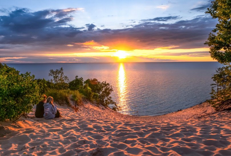 The park features a roughly one‑mile‑long sandy beach, high forested dunes, and a modern 220‑site campground where visitors can swim in the lake, sunbathe, picnic, and hike on wooded trails that wind through dunes and lead to scenic lake overlooks.