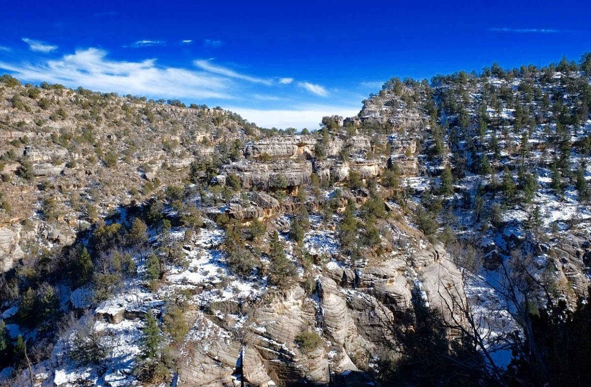 The canyon is approximately 400 feet deep and was carved by Walnut Creek, which supports a diverse ecosystem with plants ranging from desert cacti to pine forests. Visitors hike the 0.9-mile Island Trail, which descends into the canyon passing 25 well-preserved dwelling rooms nestled in limestone alcoves. The visitor center at the rim provides exhibits and panoramic views.