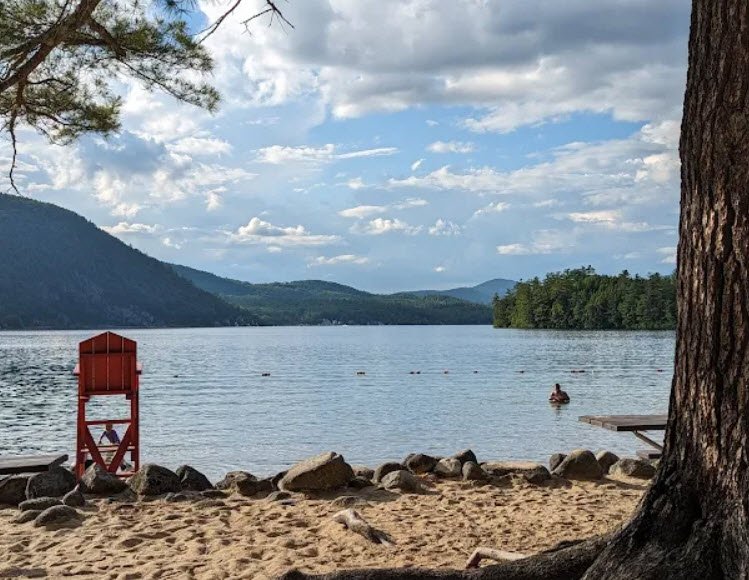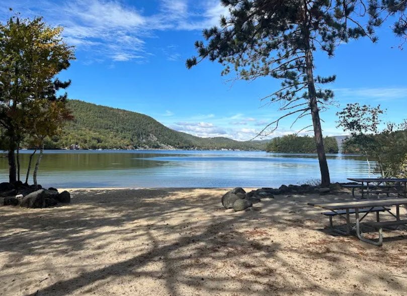 Wellington State Park spans 220 acres on the southwest shore of Newfound Lake in Bristol, New Hampshire, boasting the largest freshwater swimming beach in the state's park system with shallow, clear waters ideal for families.