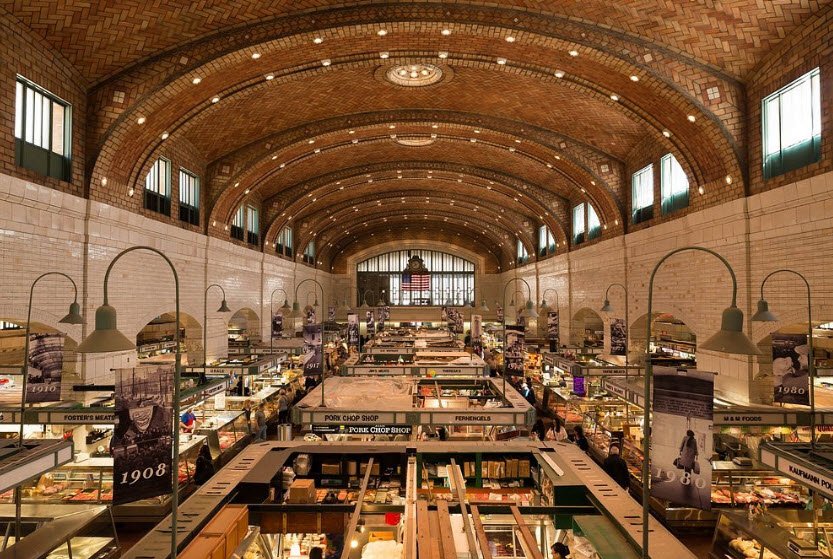 Designed by architects Hubbell & Benes with a 137-foot clock tower, vaulted Guastavino tile ceiling, and terra cotta reliefs of produce and animals, it features about 100 indoor stalls for meats, dairy, baked goods, and ethnic specialties plus 85 outdoor produce stands, serving Cleveland's immigrant communities for generations.