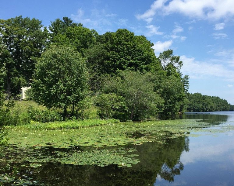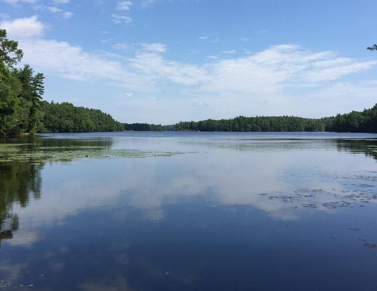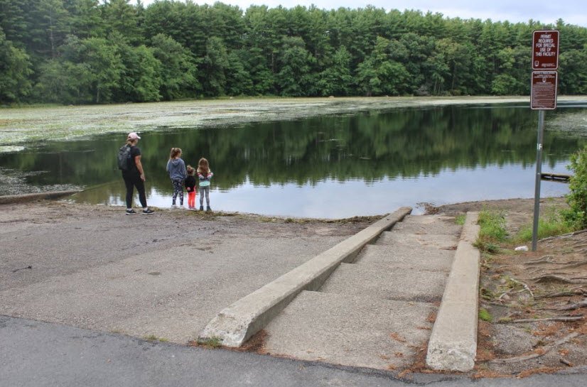 Managed by the Department of Conservation and Recreation at 331 feet elevation, it prohibits swimming, personal watercraft, water skiing, and requires leashed dogs out of water amid wooded surroundings connecting to nearby conservation lands.