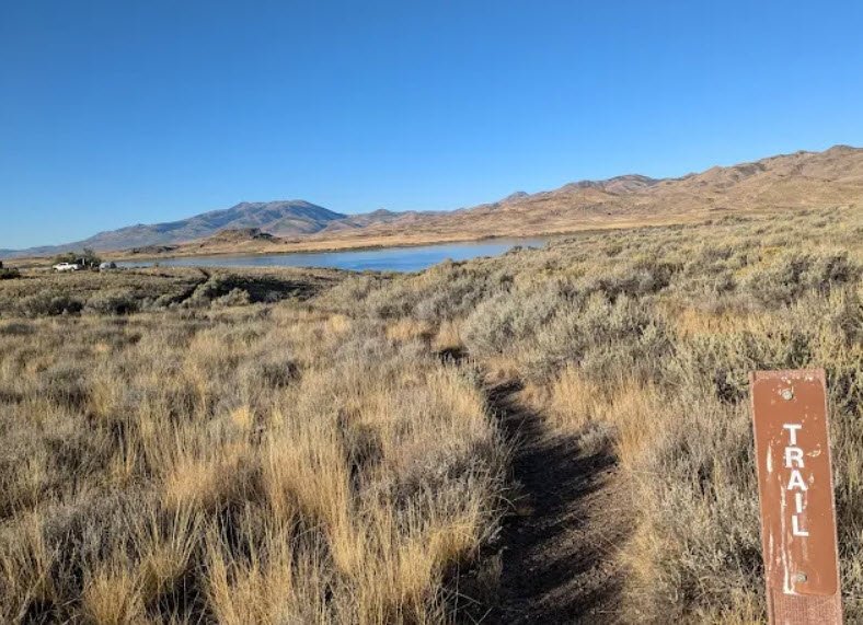 At an elevation near 7,000 feet, the landscape mixes open sagebrush plains with scattered aspen groves and distant snow‑capped peaks, offering a remote‑feeling setting where visitors can camp, hike short trails, swim or sunbathe on a sandy beach, and enjoy abundant wildlife and sweeping mountain views.