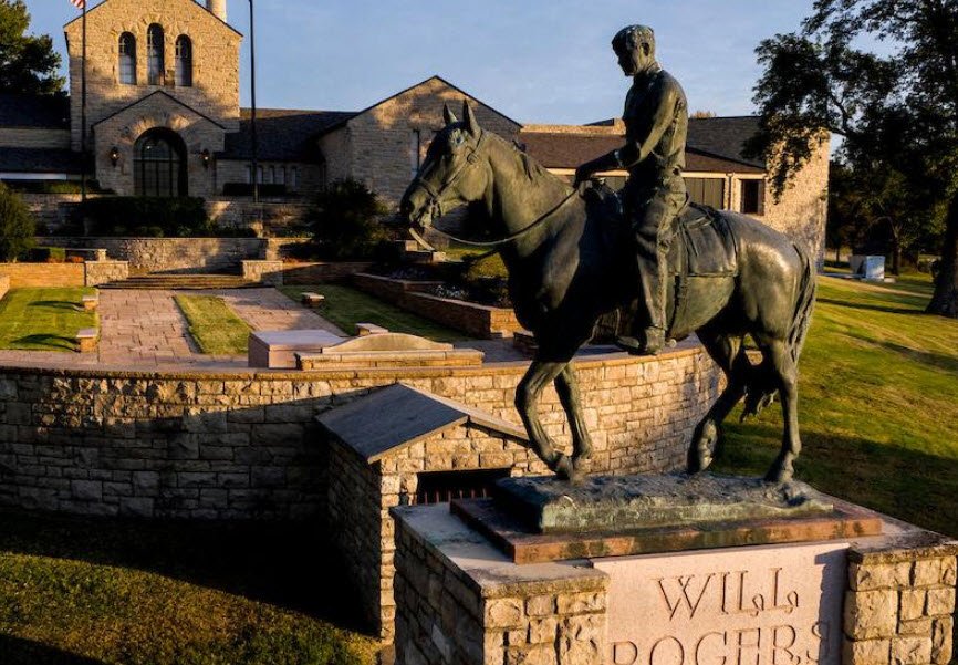 The museum contains 12 galleries, a children’s area, a theater showing his films, and a library. Will Rogers, his wife Betty, and several family members are entombed on the museum grounds, which include a beautiful sunken garden overlooking Claremore.