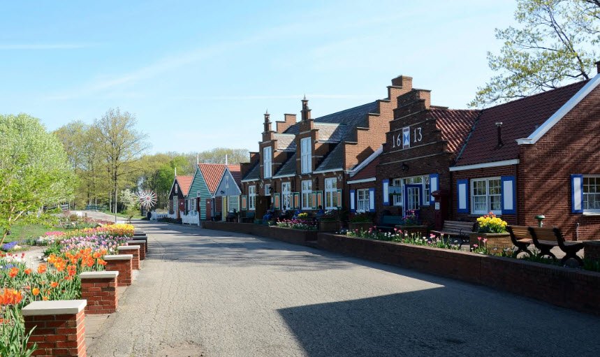 Its centerpiece is De Zwaan, a historic Dutch windmill built in 1761, which is the only authentic Dutch windmill operating in the United States and still grinds grain into flour. Visitors can tour the windmill’s five floors and enjoy the surrounding extensive gardens, which burst with around 150,000 tulips in the spring and colorful annuals through summer and fall.