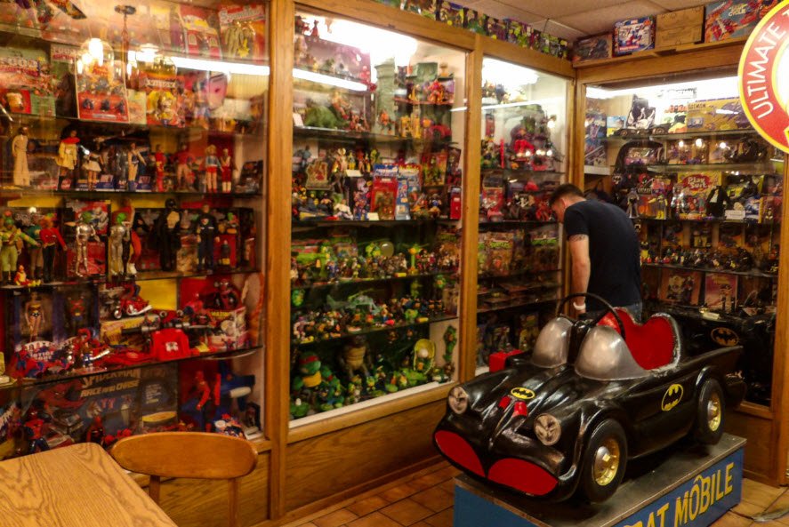 It includes eight distinct museums such as the National BB Gun Museum, Paul Harvey Jr. 50’s Era Museum, Wild West Museum, Stearnsy Bear Museum, and World of Checkers Museum. The collection features toys from the 1800s to present day, covering antique trains, dolls, action figures like G.I. Joe, Barbie dolls, Star Wars and Star Trek memorabilia, Hot Wheels, Disney-themed toys, and mechanical banks.