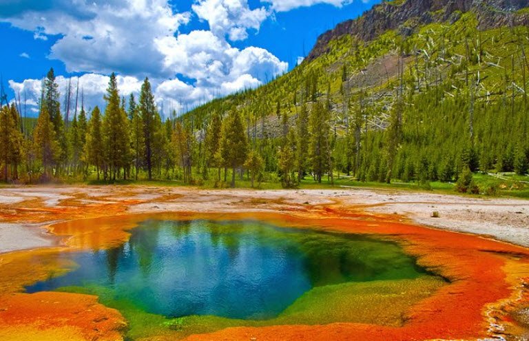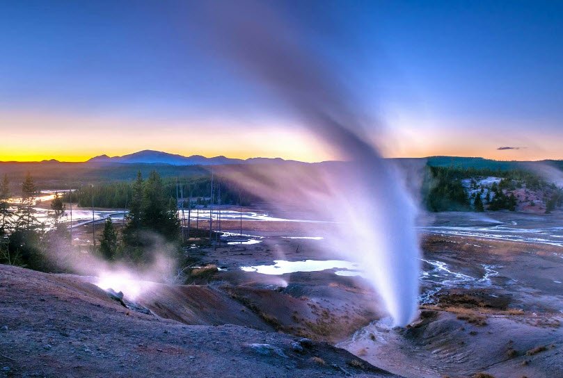 It is renowned for its diverse wildlife such as grizzly bears, wolves, bison, and elk, as well as its extensive geothermal features including geysers like Old Faithful. The park sits at the convergence of the Rocky Mountains, Great Plains, and Great Basin, featuring a variety of ecosystems with abundant forests, rivers, and mountains. Native American tribes have inhabited the Yellowstone region for more than 11,000 years, using the land for hunting, fishing, and gathering.