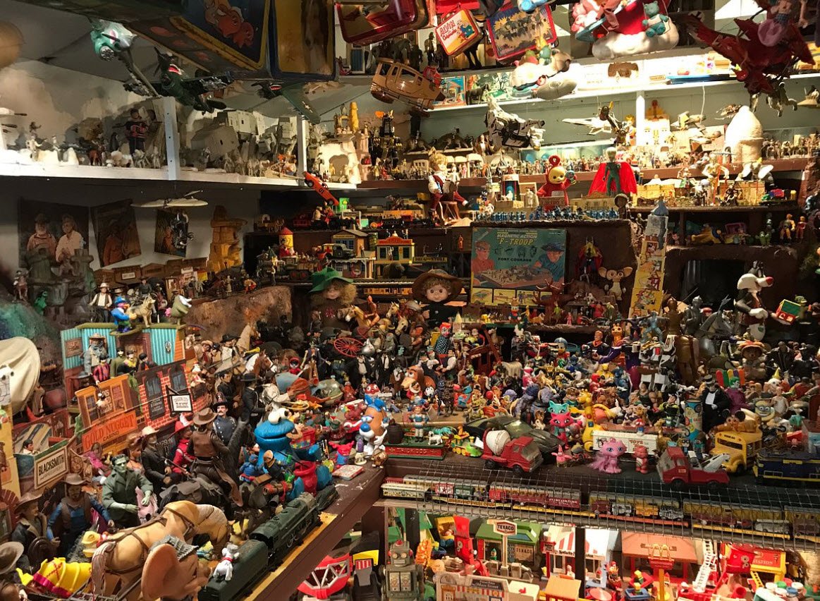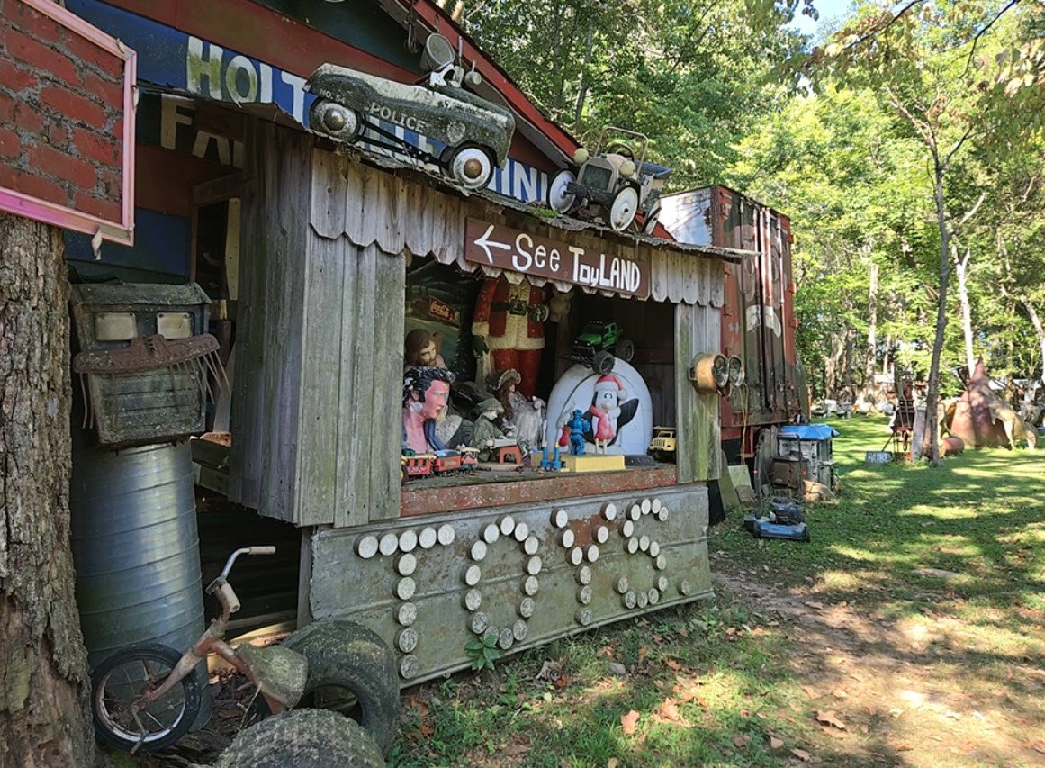 Over time, the property evolved into an eccentric folk art garden filled with whimsical, pun-filled sculptures made from repurposed objects and junk art, reflecting a quirky, humorous look at rural life. The site also features a toy museum housing thousands of vintage toys arranged in detailed dioramas that evoke nostalgia and childhood memories.