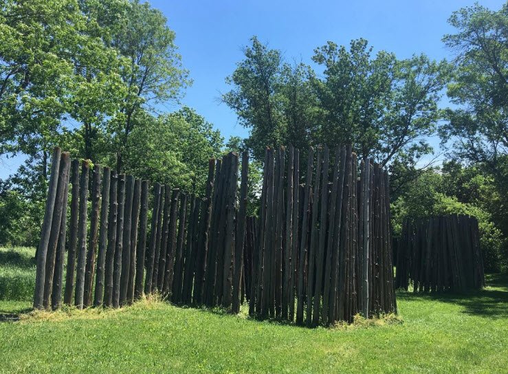 The park covers 172 acres along the Crawfish River and features reconstructed portions of the village's stockade made of tall wooden posts, as well as several large, flat-topped earthen mounds that served as platforms for dwellings and ceremonies. The village was divided into different sections including residential and elite areas, surrounded by log-wall fortifications for protection.