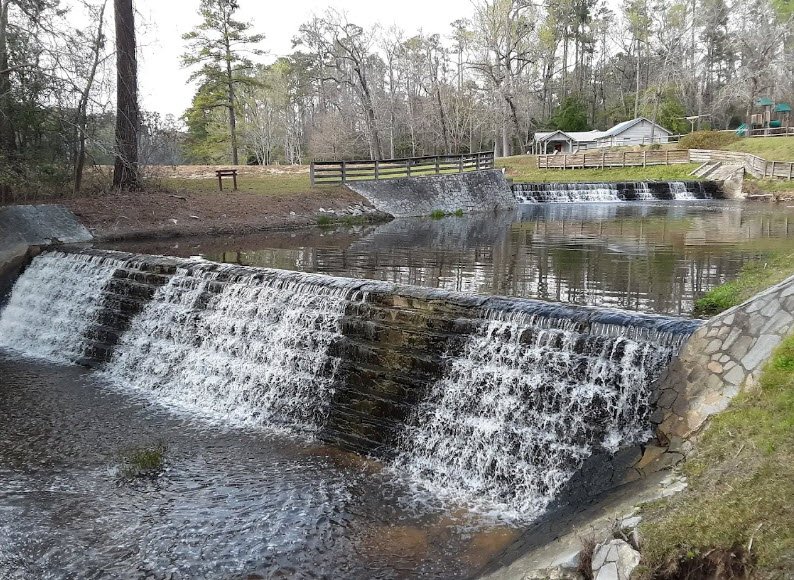 One of 16 parks built by the Civilian Conservation Corps in the 1930s, it preserves historic structures like a picturesque spillway, picnic shelters, and a pumphouse, plus the 1.5-mile Dogwood Nature Trail looping past ponds, the campground, cabins, and wildlife such as alligators, armadillos, and birds.
