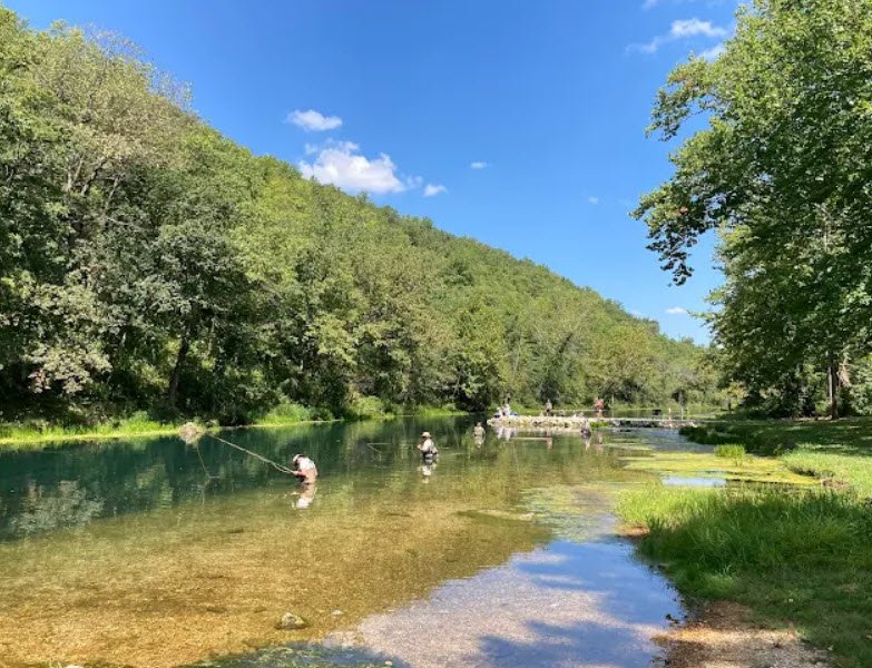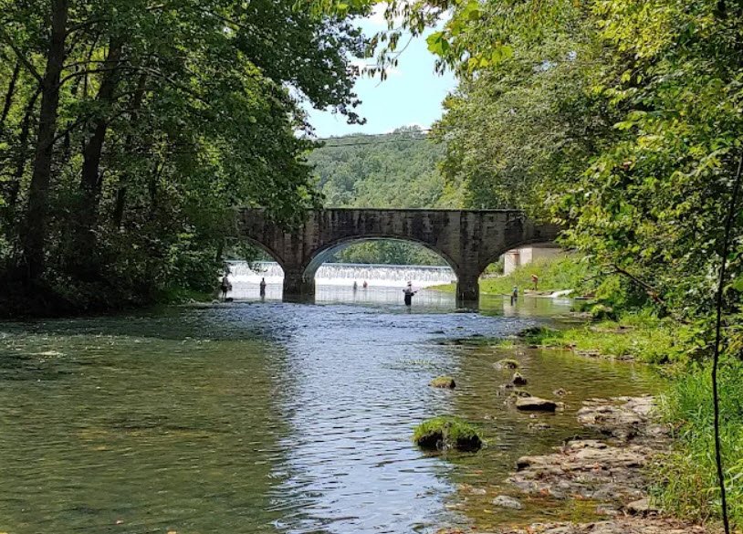 The park lies roughly 12 miles west of Lebanon in the Ozarks, with the spring forming a trout‑stocked stream that attracts fly‑fishing and catch‑and‑release anglers, especially for rainbow trout. Beyond fishing, the park offers camping in five wooded campgrounds, cabins, a historic CCC‑era dining lodge and nature center, hiking and horseback trails.