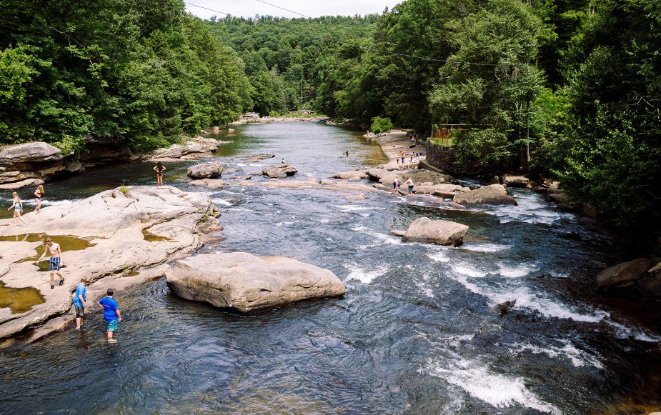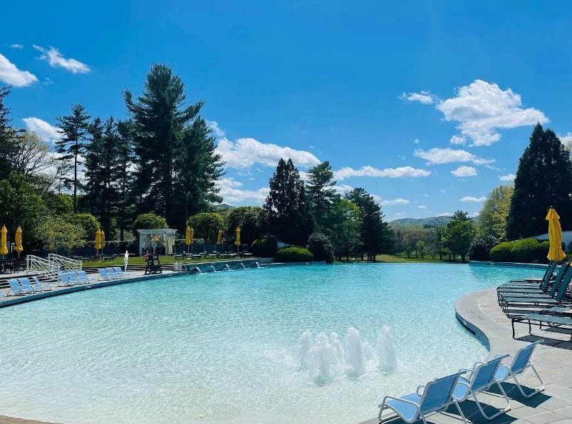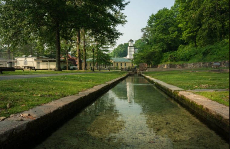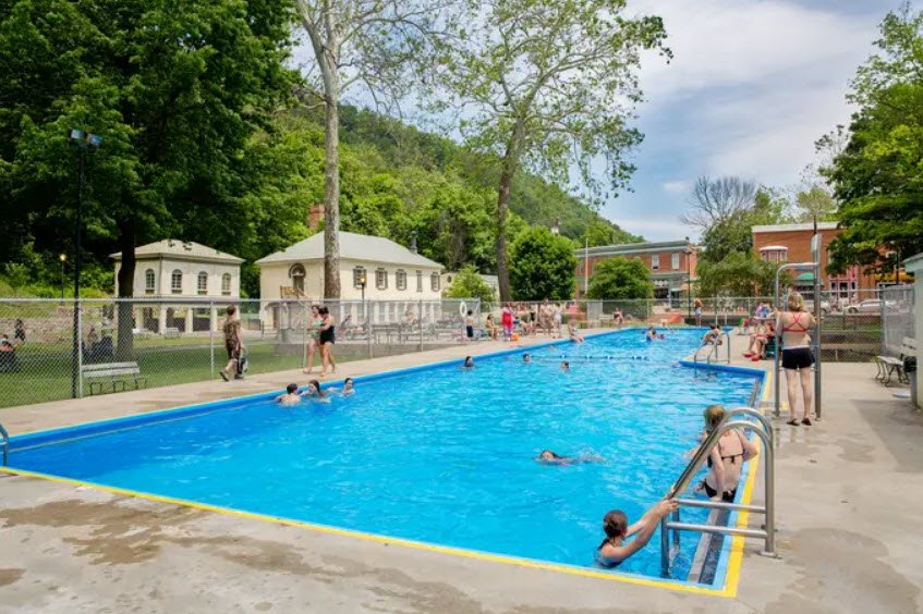 Berkeley Springs State Park in West Virginia features a historic swimming pool filled with natural spring water flowing constantly at about 74 degrees Fahrenheit.